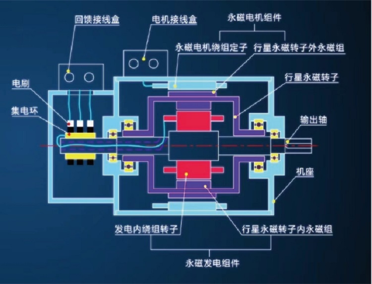 多功能雙永磁調(diào)速一體機(jī)是永磁電動(dòng)機(jī)與永磁發(fā)電機(jī)嵌套集成的多功能電機(jī)。主要由內(nèi)繞組轉(zhuǎn)子、內(nèi)外雙永磁行星轉(zhuǎn)子及電機(jī)定子繞組組成,其中內(nèi)繞組轉(zhuǎn)子是輸出軸,永磁行星轉(zhuǎn)子的外永磁體與電機(jī)定子繞組電磁耦合形成永磁電機(jī);內(nèi)繞組轉(zhuǎn)子與永磁行星轉(zhuǎn)子的內(nèi)永磁體電磁耦合形成發(fā)電機(jī),控制內(nèi)繞組中的感生電流的大小控制轉(zhuǎn)子的輸出轉(zhuǎn)矩與轉(zhuǎn)速。并將內(nèi)繞組中多余能量通過集電環(huán)回饋至電網(wǎng)再利用。