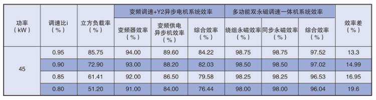 下表為與平方轉(zhuǎn)矩系統(tǒng)45kW-4(Y2系列異步電機(jī)使用變頻供電)同工況效率對比