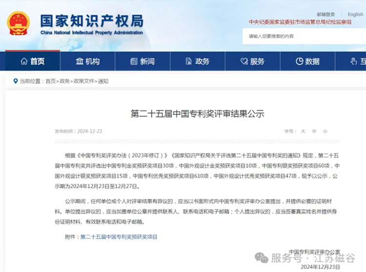 正值2025年元旦佳節(jié),江蘇磁谷迎來(lái)了一個(gè)振奮人心的消息:公司自主研發(fā)的《繞組式無(wú)刷耦合傳動(dòng)裝置》發(fā)明專利榮獲中國(guó)專利獎(jiǎng)優(yōu)秀獎(jiǎng)。這一殊榮不僅為公司的科技創(chuàng)新征程增添了輝煌篇章,更為新年的啟航注入了澎湃動(dòng)力與無(wú)限可能。 中國(guó)專利獎(jiǎng),由國(guó)家知識(shí)產(chǎn)權(quán)局?jǐn)y手世界知識(shí)產(chǎn)權(quán)組織共同設(shè)立,乃我國(guó)專利領(lǐng)域的至高榮譽(yù),其評(píng)選標(biāo)準(zhǔn)嚴(yán)苛,強(qiáng)調(diào)知識(shí)產(chǎn)權(quán)的創(chuàng)造、保護(hù)與應(yīng)用,對(duì)激發(fā)技術(shù)創(chuàng)新、驅(qū)動(dòng)經(jīng)濟(jì)高質(zhì)量發(fā)展具有深遠(yuǎn)影響。